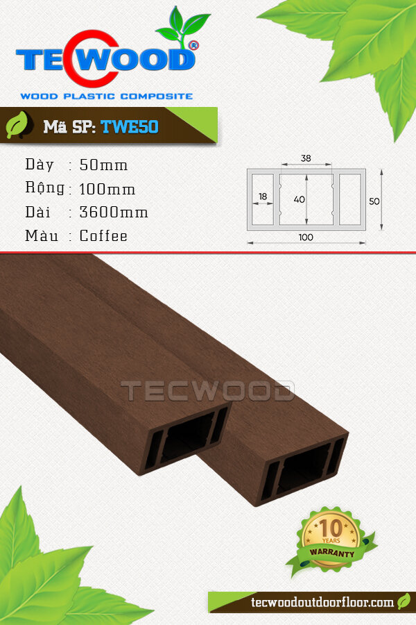 Thanh gỗ nhựa TecWood TWE50 với quy cách 50x100 dài 3600mm được sản xuất từ chất liệu wood plastic composite siêu chịu nắng, chịu nước ứng dụng trong trang trí ngoài trời, làm giàn lam che nắng, pergola, hàng rào giả gỗ.