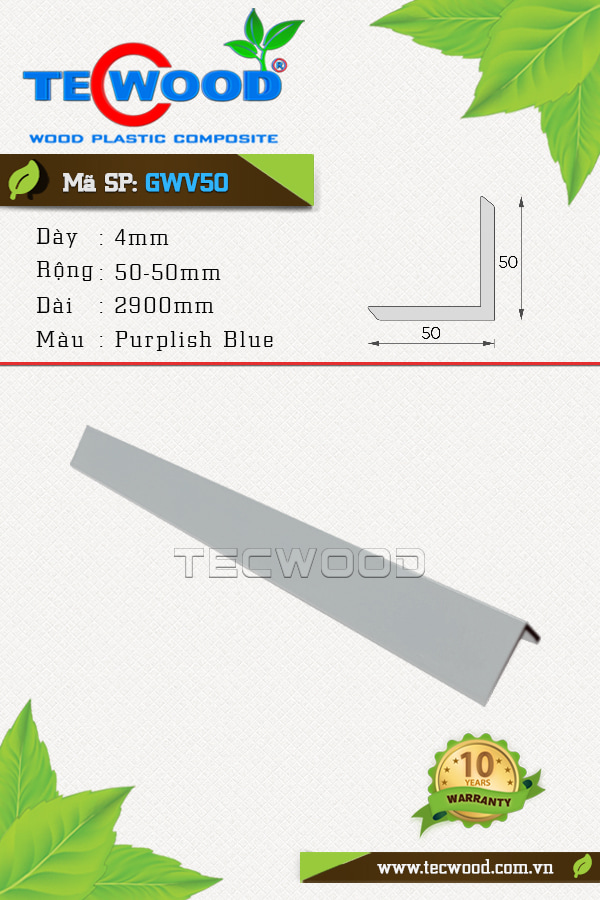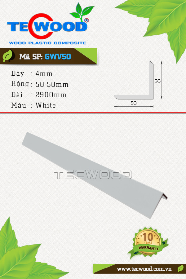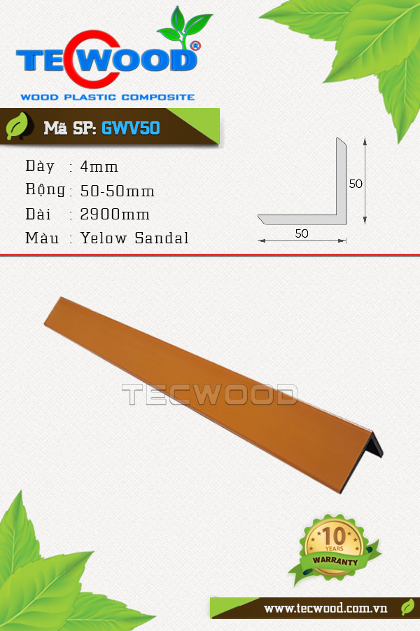 Nẹp chữ L GWV50 thương hiệu TecWood được cấu tạo từ gỗ nhựa tổng hợp WPC, có độ bền cao, chắc chắn, có khả năng chịu lực rất tốt. Thanh nẹp GWV50 với quy cách 50x50x2900mm thường được kết hợp với tấm ốp gỗ nhựa TecWood TWZ195 mang lại vẻ đẹp hiện đại, sang trọng cho không gian nội thất.